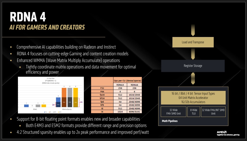 La estructura base de la unidad de computación no ha cambiado. Con RDNA 4 seguimos teniendo 64 shaders, un núcleo para acelerar trazado de rayos, dos unidades para acelerar IA y cuatro unidades de texturizado. Según AMD, con RDNA 4: