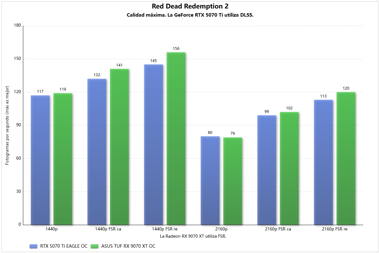 Red Dead Redemption rinde un poco mejor en la ASUS TUF Gaming Radeon RX 9070 XT OC. No es una diferencia grande, pero suficiente para darle una pequeña victoria (entre 1 y 2 FPS en nativo, y vemos que el FSR escala mejor en este juego que el DLSS).