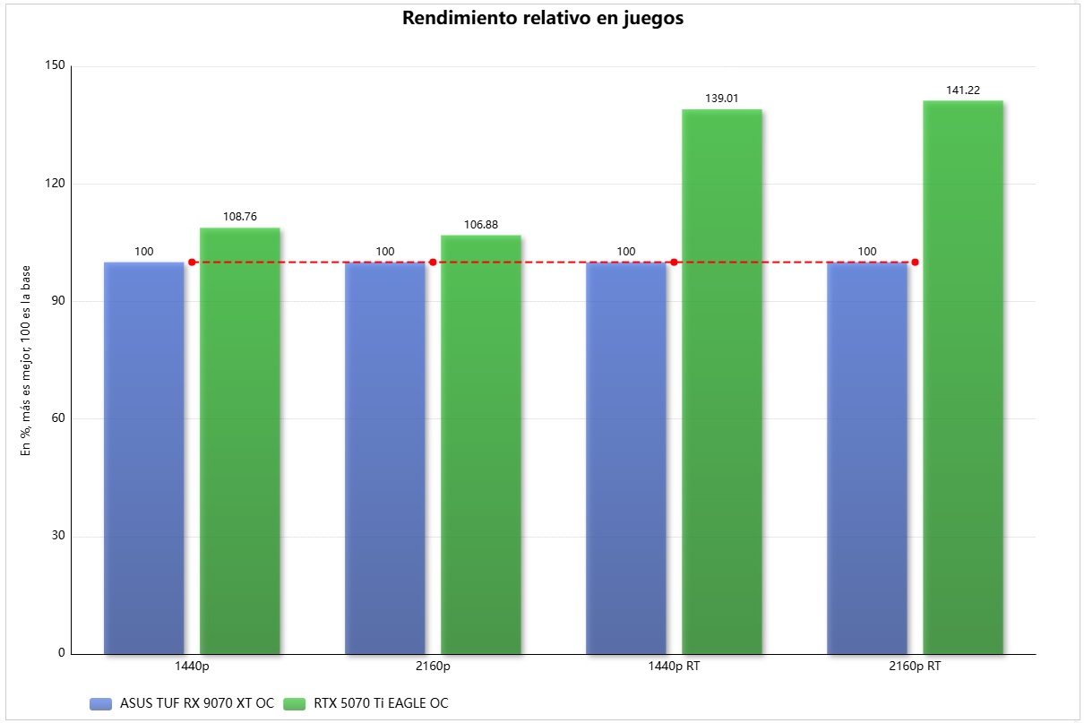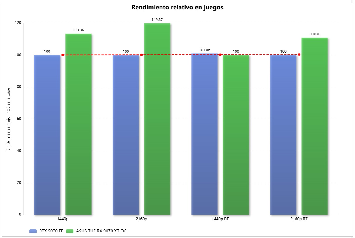 Podemos sacar en claro de estas pruebas que la ASUS TUF Gaming Radeon RX 9070 XT OC rinde un poco peor que la GeForce RTX 5070 Ti en rasterización, y que las diferencias en trazado de rayos son mucho más grandes. A continuación veremos en qué se traduce todo esto en porcentajes concretos.