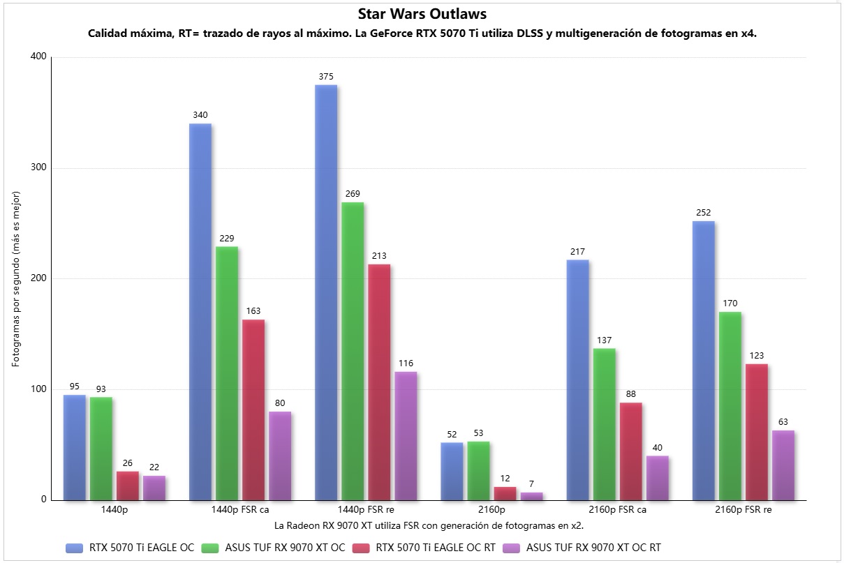 En Star Wars Outlaws tenemos prácticamente un empate entre ambas en rasterización y resolución nativa, pero la GeForce RTX 5070 Ti rinde mejor con trazado de rayos activado, y la multigeneración de fotogramas en modo x4 marca una diferencia muy grande, como podemos ver en las gráficas.