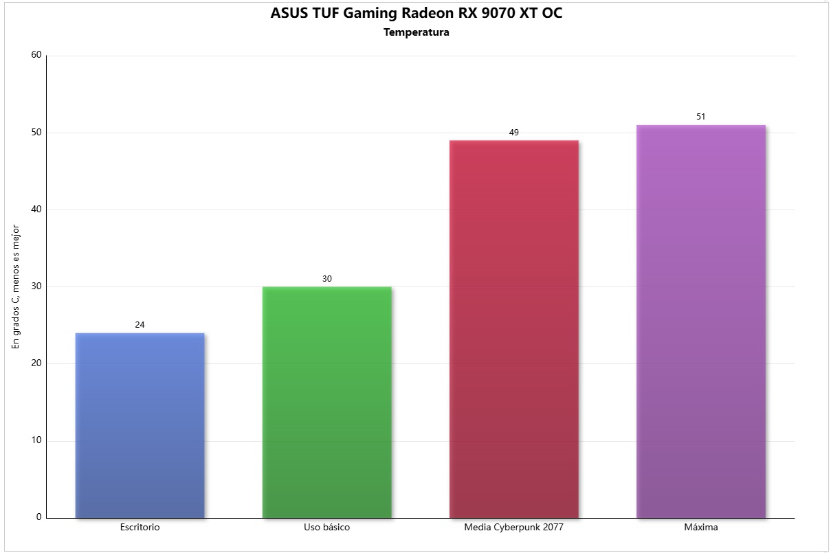 Las temperaturas de la ASUS TUF Gaming Radeon RX 9070 XT OC son excelentes, tanto que la verdad es que al principio me sorprendieron. Teniendo en cuenta la potencia que ofrece esta tarjeta gráfica estas son, sin duda, las mejores temperaturas que he registrado en un modelo de su clase y gama hasta el momento, con solo 51 grados C de pico.