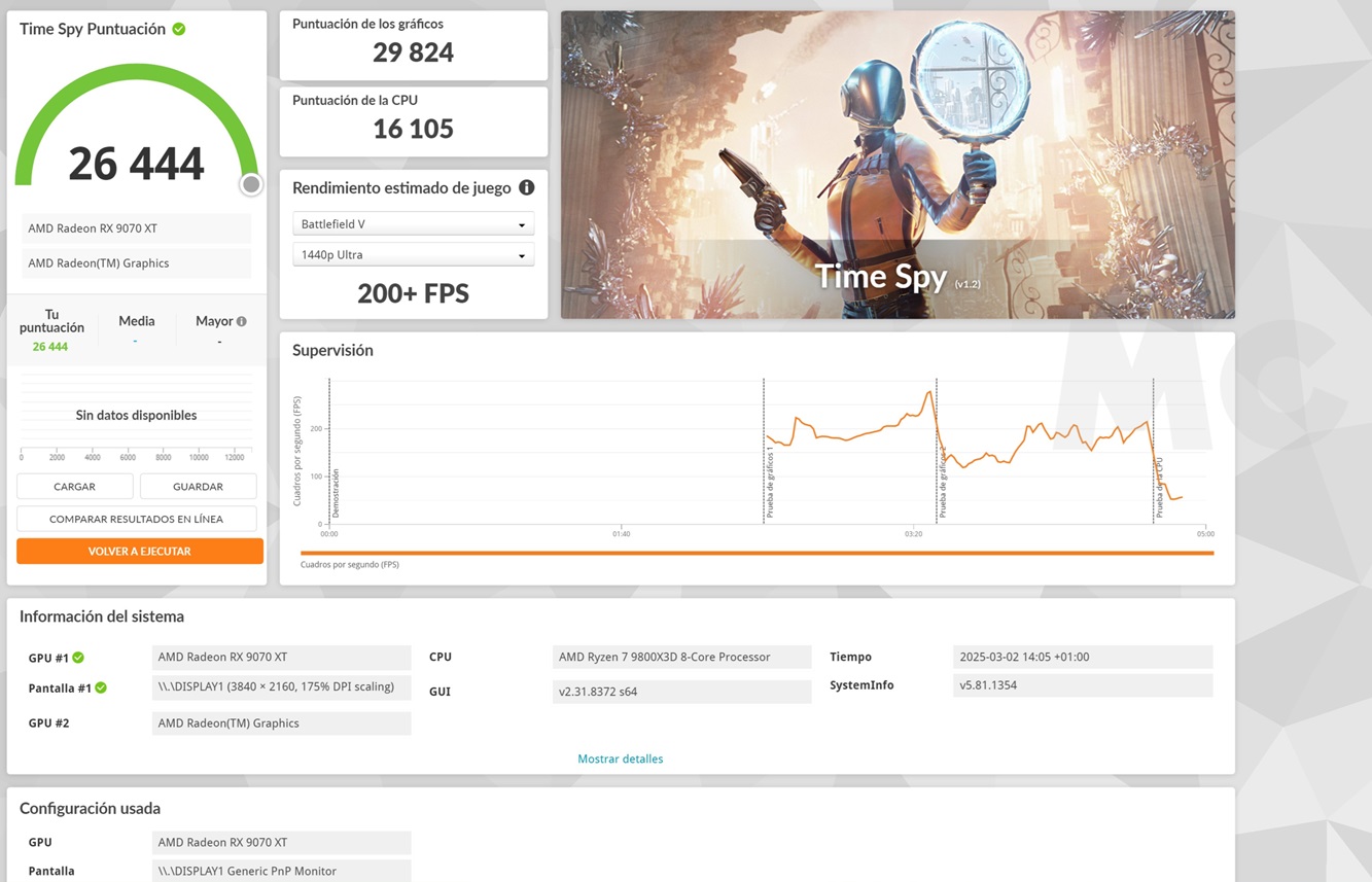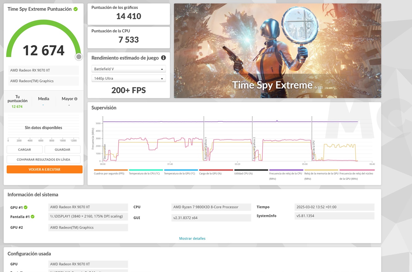 Con la versión Extreme de Time Spy, que eleva la resolución a 4K, tenemos también un resultado muy bueno con esos 14.410 puntos en GPU, que de nuevo confirman que la ASUS TUF Gaming Radeon RX 9070 XT OC es rival directo de la GeForce RTX 5070 Ti.