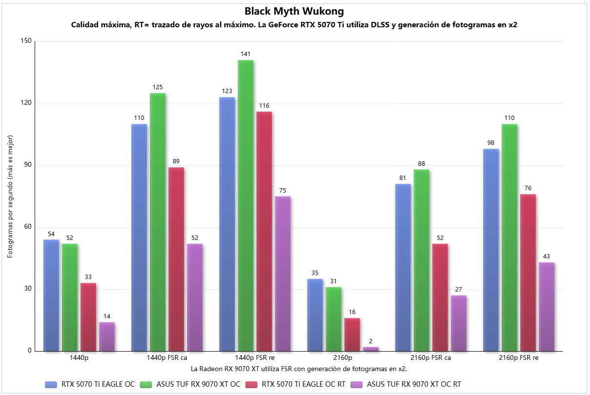 Vamos ahora con Black Myth Wukong, que es uno de los grandes referentes del sector, y uno de los títulos más exigentes. La GeForce RTX 5070 Ti vuelve a ganar la partida con una diferencia pequeña en rasterización, y una victoria mucho más grande en trazado de rayos. En 4K con trazado de rayos en nativo la gráfica de NVIDIA logra 16 FPS y la ASUS TUF Gaming Radeon RX 9070 XT OC queda en 2 FPS, es decir, rinde 8 veces mejor.