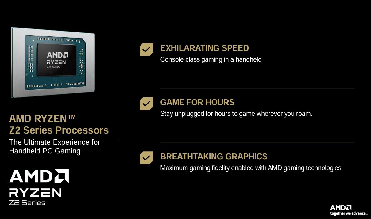 - APU AMD Ryzen Z2. Hay varias opciones, pero parece que el Ryzen Z2 Go sería la más probable para reducir costes. Este tiene una CPU Zen 3+ con 4 núcleos y 8 hilos (8 MB de L3) a 3 GHz-4,3 GHz.