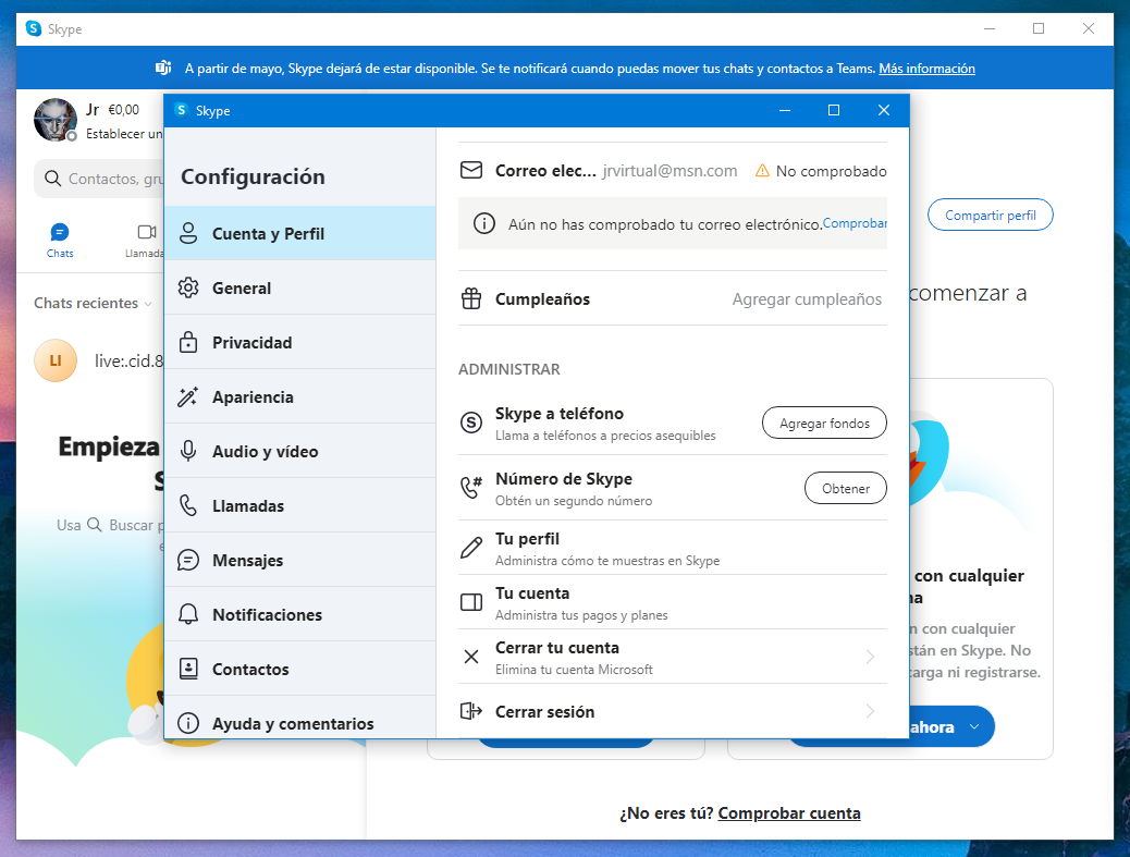Si has estado usando el servicio hasta ahora, quieres guardar los datos que allí tienes o los quieres utilizar para realizar la migración a otro servicio, debes hacerlo antes del final de su ciclo de vida. Si vas a usar Microsoft Teams, es tan sencillo con iniciar sesión en la aplicación con las credenciales de Skype. Una vez iniciada la sesión, todos los chats y contactos se transferirán automáticamente a la aplicación.