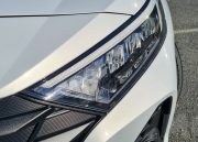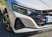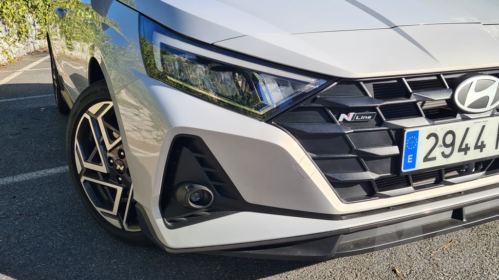 Una de las señas de identidad de este modelo es el frontal. En su parte delantera, el i20 N Line presenta un diseño claramente más agresivo que la versión estándar, sobre todo por la elección de materiales y colores. La parrilla negra en cascada, característica distintiva de los modelos N Line, domina el frontal con un panel de rombos de gran tamaño y el logotipo de la marca en el centro. Los faros LED con sus formas afiladas y agresivas, proporcionando una «mirada» que se complementa perfectamente con esa parrilla. El complemento de las luces diurnas LED refuerzan su carácter deportivo. El paragolpes específico N Line incorpora una línea de carácter gris que le da un aspecto más dinámico, mientras que las entradas de aire laterales con forma triangular añaden un toque de agresividad.