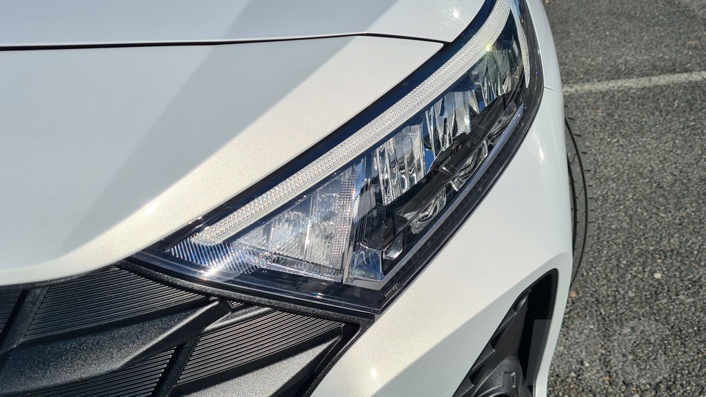 Una de las señas de identidad de este modelo es el frontal. En su parte delantera, el i20 N Line presenta un diseño claramente más agresivo que la versión estándar, sobre todo por la elección de materiales y colores. La parrilla negra en cascada, característica distintiva de los modelos N Line, domina el frontal con un panel de rombos de gran tamaño y el logotipo de la marca en el centro. Los faros LED con sus formas afiladas y agresivas, proporcionando una «mirada» que se complementa perfectamente con esa parrilla. El complemento de las luces diurnas LED refuerzan su carácter deportivo. El paragolpes específico N Line incorpora una línea de carácter gris que le da un aspecto más dinámico, mientras que las entradas de aire laterales con forma triangular añaden un toque de agresividad.