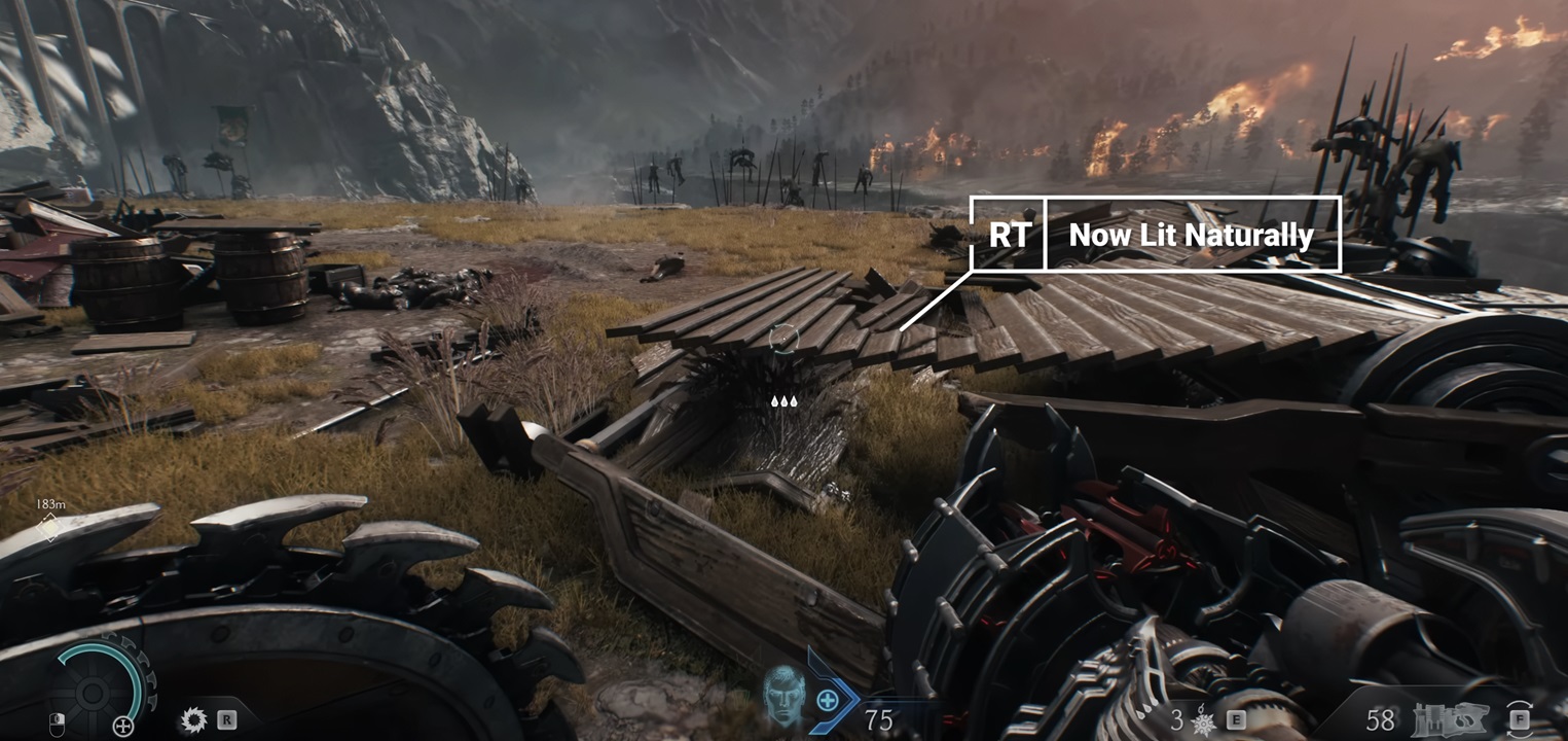 Parece que el resultado no es perfecto, porque todavía se aprecia un poco de «popping» en ciertos elementos gráficos, como la hierba, por ejemplo, pero funciona y marca una gran diferencia. Esta tecnología también ha hecho que sea posible generar entre 40 y 50 enemigos de forma simultánea en pantalla, y todo ello con trazado de rayos aplicado.