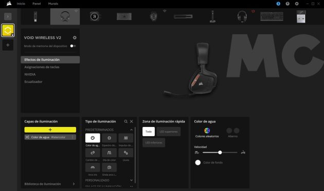 En PC tenemos un mundo de posibilidades con la aplicación iCUE. Con ella podremos crear ecualizadores personalizados, modificar el tipo de sonido, ajustar el brillo de la iluminación LED RGB y personalizara con diferentes colores, efectos y patrones, podremos configurar el botón personalizable que incluyen estos auriculares y asignarle una función concreta. Por ejemplo, podemos configurarlo para que nos permita silenciar o activar el micrófono.