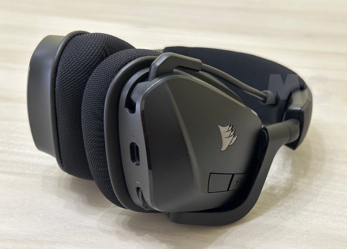 La disposición de los botones es muy simple, pero correcta. Tenemos un botón de encendido y apagado, y de otro personalizable a través de iCUE. También contamos con una rueda en el auricular izquierdo para regular el volumen fácil y rápidamente, y el puerto de conexión cableada para cargar los Corsair VOID WIRELESS v2 está bien situado y es de fácil acceso.