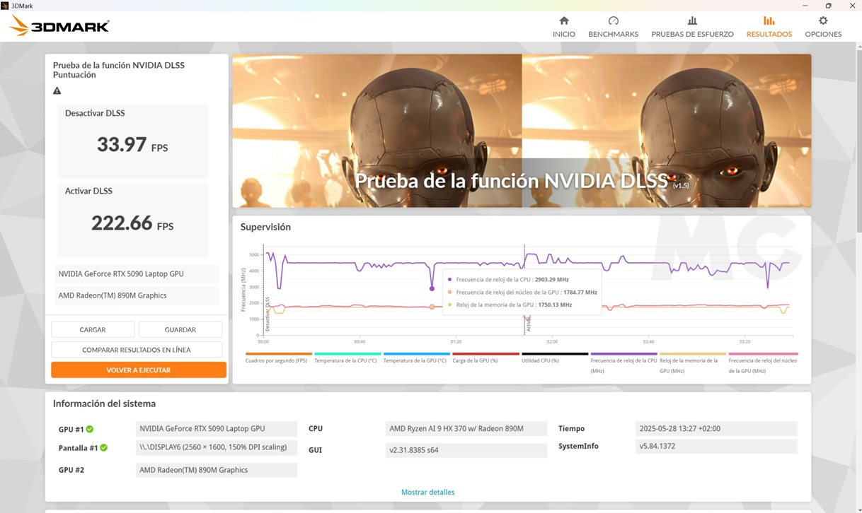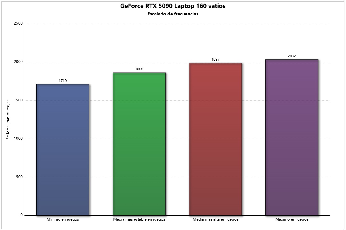 La GeForce RXT 4090 Laptop de esta comparativa alcanza una media alta estable de 2.235 MHz y la GeForce RTX 5090 Laptop solo llega a los 1.987 MHz, así que hay una diferencia clara en los valores de frecuencia de la GPU que, obviamente, afectará al rendimiento final.