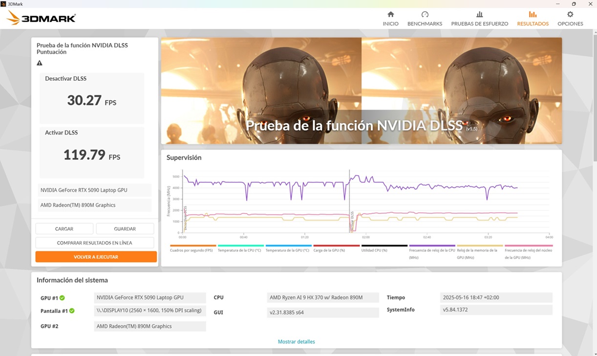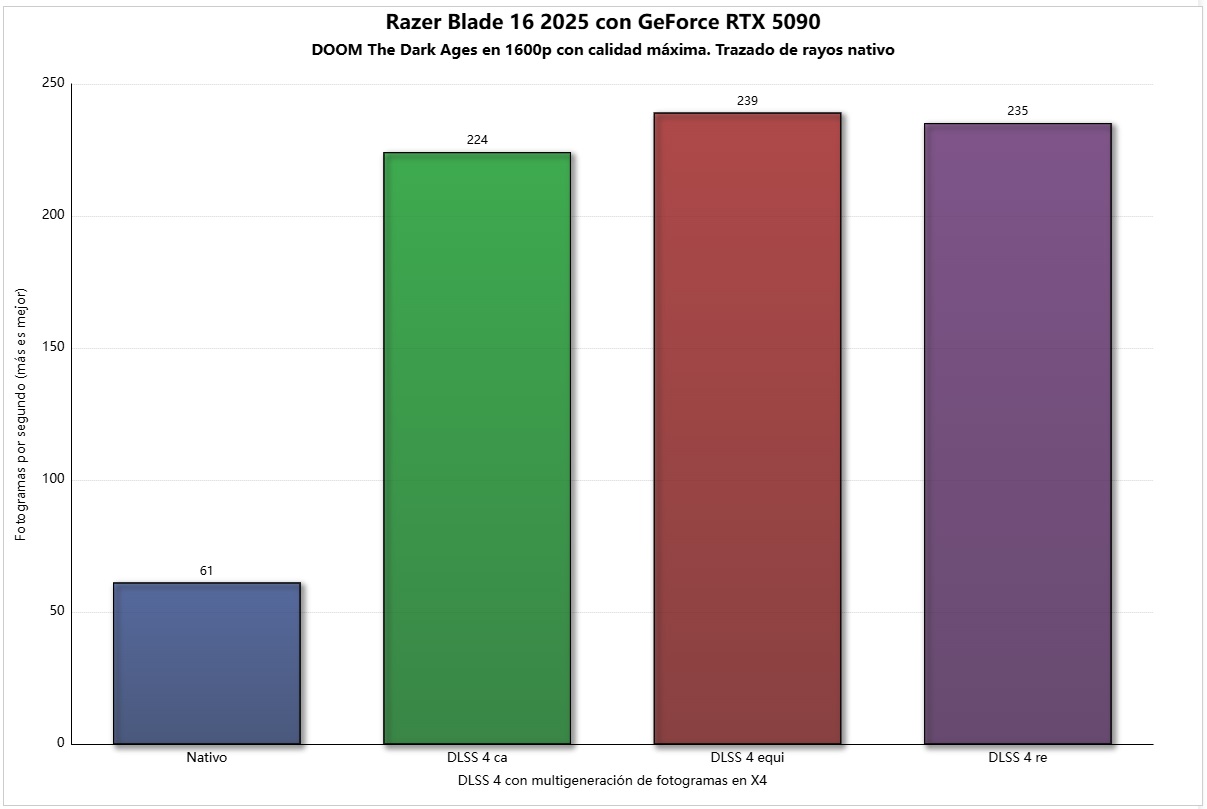 Esta prueba renderizaa una escena muy exigente de forma nativa, y luego aplica DLSS para medir la mejora de rendimiento que se produce. Sin DLSS tenemos una media de poco más de 30 FPS con la GeForce RTX 5090 Laptop que monta el Razer Blade 16 2025, y con DLSS 4 en modo rendimiento y multigeneración de fotogramas en X2 la media sube a 119 FPS. Si activamos el modo X4 la media se dispara hasta los 222 FPS.