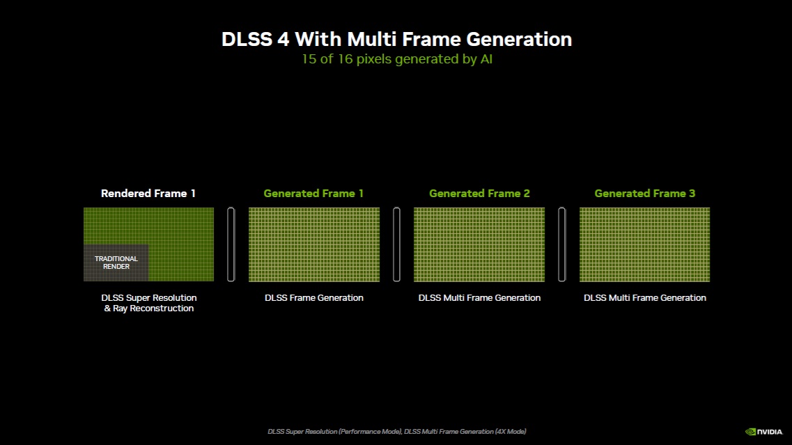 La multigeneración de fotogramas también se beneficia del nuevo modelo de transformación, porque esos fotogramas se generan a partir de fotogramas renderizados de forma tradicional que ya tienen aplicadas las tecnologías Super Resolution y Ray Reconstruction, lo que permite que los fotogramas generados en la GPU presenten una mayor calidad y estabilidad de la imagen.