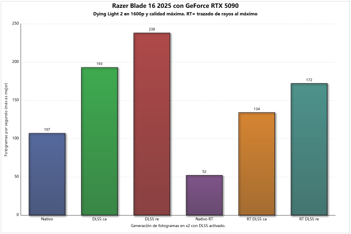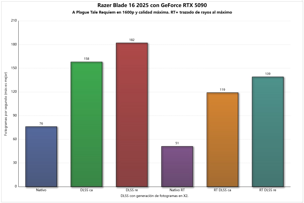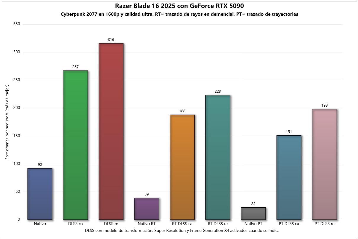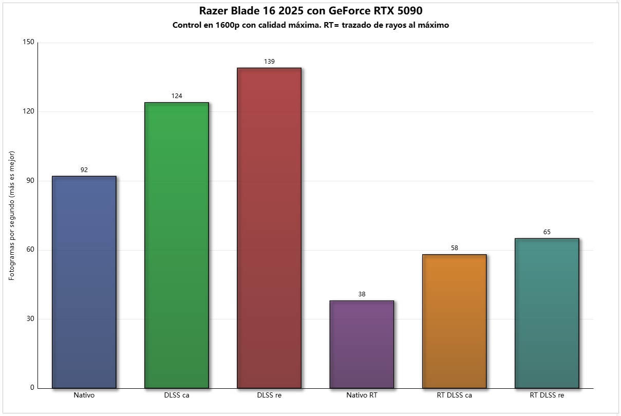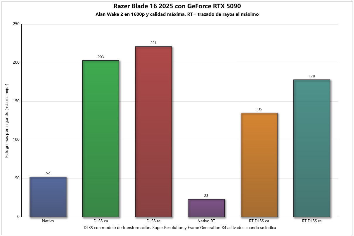 En términos de rendimiento el Razer Blade 16 2025 es uno de los portátiles más potentes del mercado. Con él podremos jugar en 1600p sin ningún tipo de problema, incluso con trazado de rayos completo gracias a sus 24 GB de VRAM y al soporte de DLSS 4, reconstrucción de rayos y multigeneración de fotogramas, tres tecnologías que, como hemos visto, marcan una enorme diferencia en juegos, ya que nos permiten pasar de 23 FPS a 135 FPS en juegos tan exigentes como Alan Wake 2.