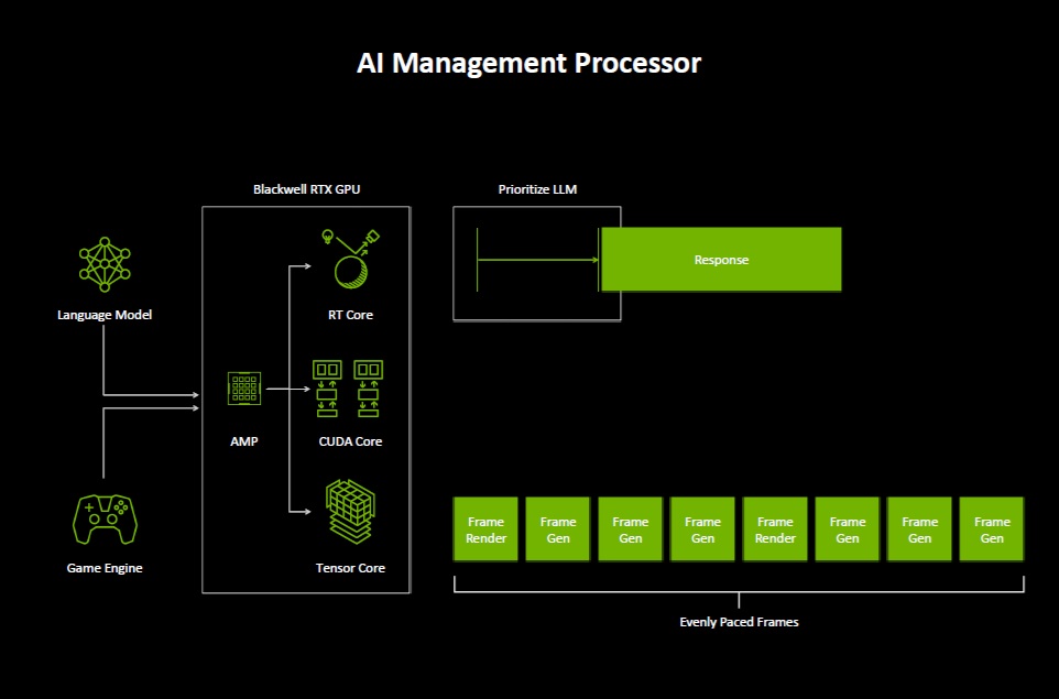 Tenemos núcleos especializados que realizan trabajos muy diferentes. Para que shaders, núcleos tensor y núcleos RT puedan hacer correctamente su trabajo, NVIDIA ha introducido en Blackwell el procesador de gestión de IA (AMP), que se encarga de programar las tareas en función de la carga de trabajo para que estas se resuelvan en los núcleos correspondientes. Así, por ejemplo, es posible evitar que las tareas de IA puedan interferir en las tareas de renderizado, y viceversa.
