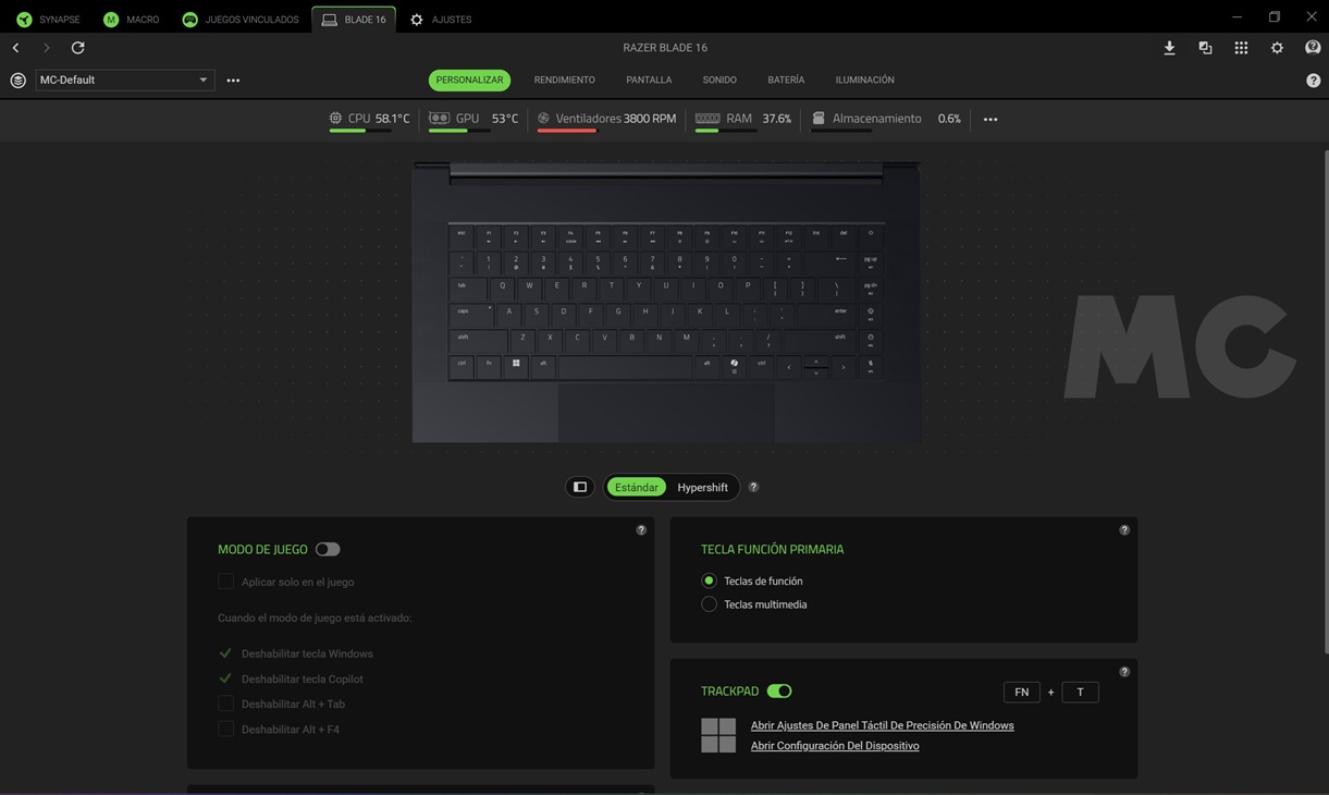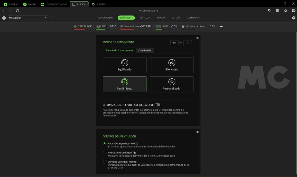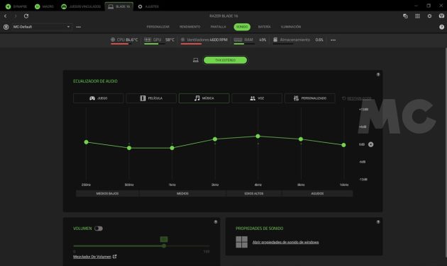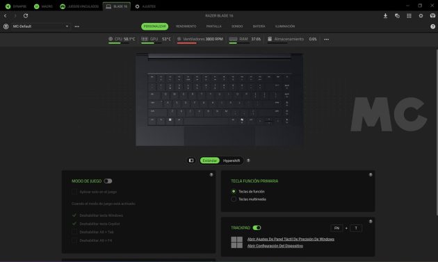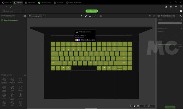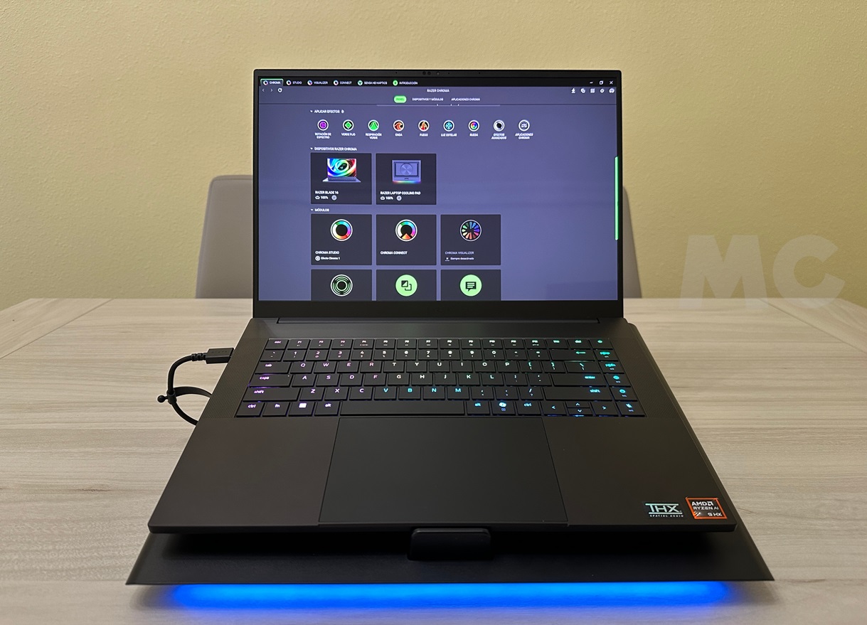 El Razer Blade 16 2025 es compatible con la base de refrigeración Razer Laptop Cooling Pad, que permite se integra a la perfección en el software Synapse, y también en Chroma, y nos ayuda a reducir las temperaturas de trabajo de la CPU y la GPU hasta en un 18%.