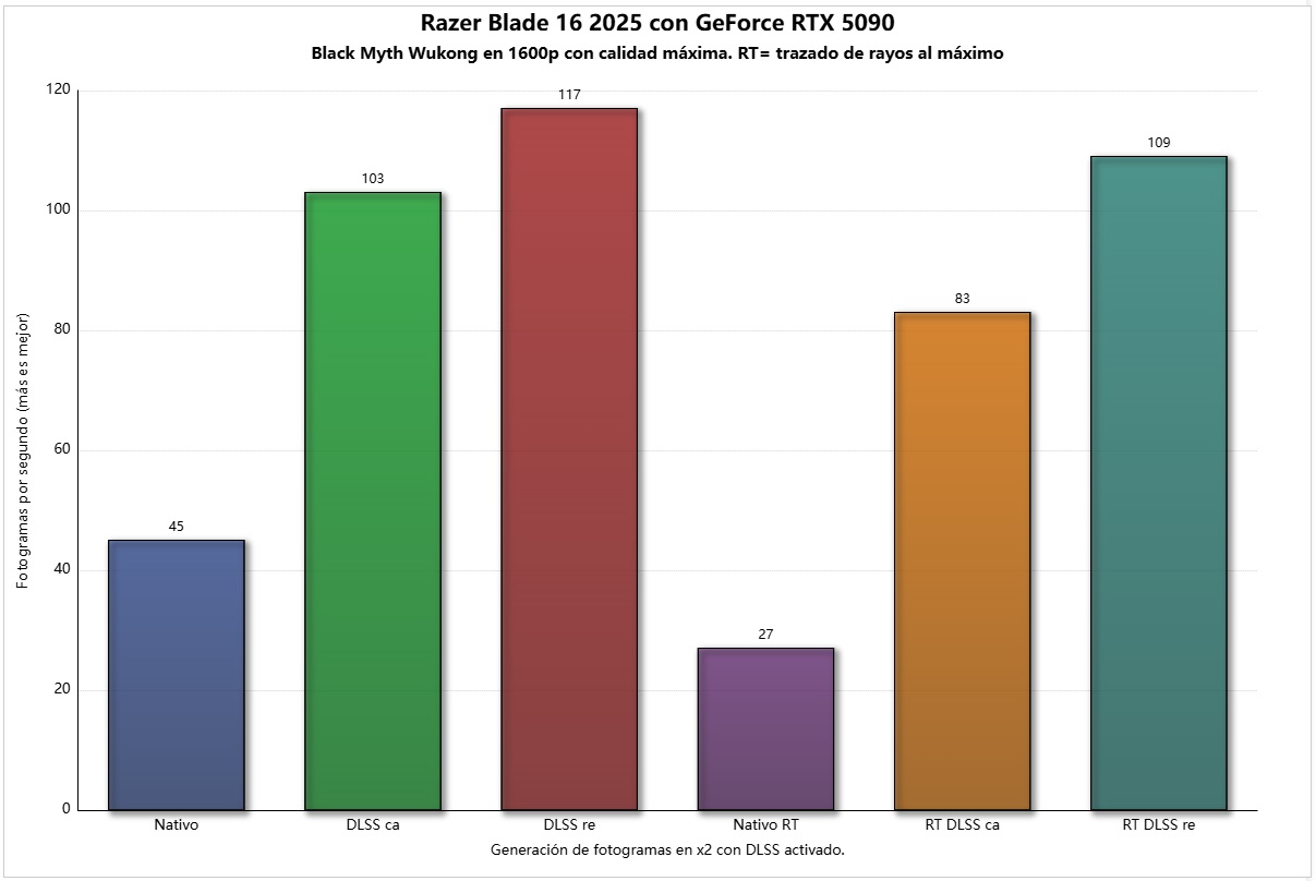 Para terminar vamos con Black Myth Wukon, un juego con un nivel de exigencia tremendo que es jugable en 1600p con calidad máxima, ya que registra 45 FPS con la GeForce RTX 5090 Laptop. Al activar el trazado de rayos el rendimiento cae a 27 FPS, pero podemos recurrir al DLSS en modo calidad y la generación de fotogramas en modo X2 para subir hasta los 103 FPS y 83 FPS, respectivamente.