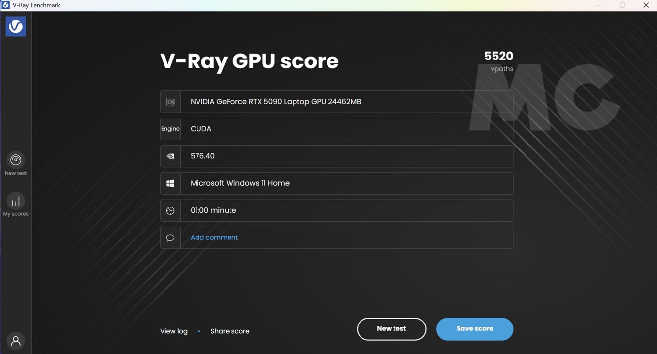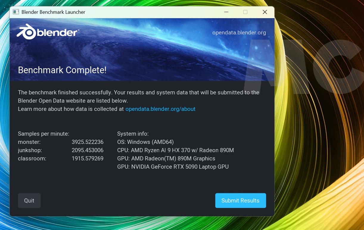 Otra prueba de renderizado que mide el rendimiento de la GPU en muestras por minuto, utilizando tres escenas diferentes. La puntuación que consigue la GeForce RTX 5090 Laptop en esta prueba es excelente, ya que supera a una GeForce RTX 5070 de escritorio, cuyo TGP es de 250 vatios.