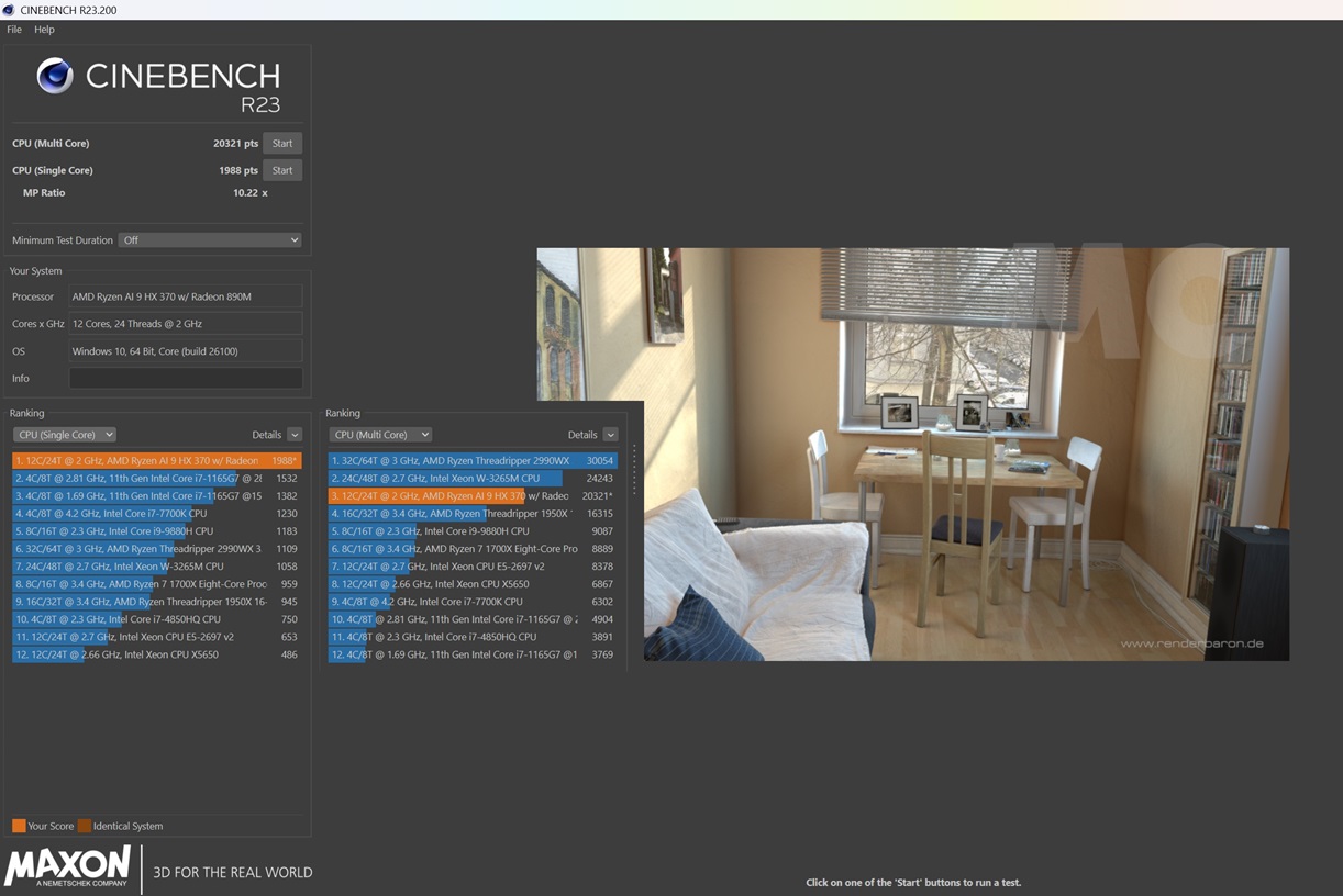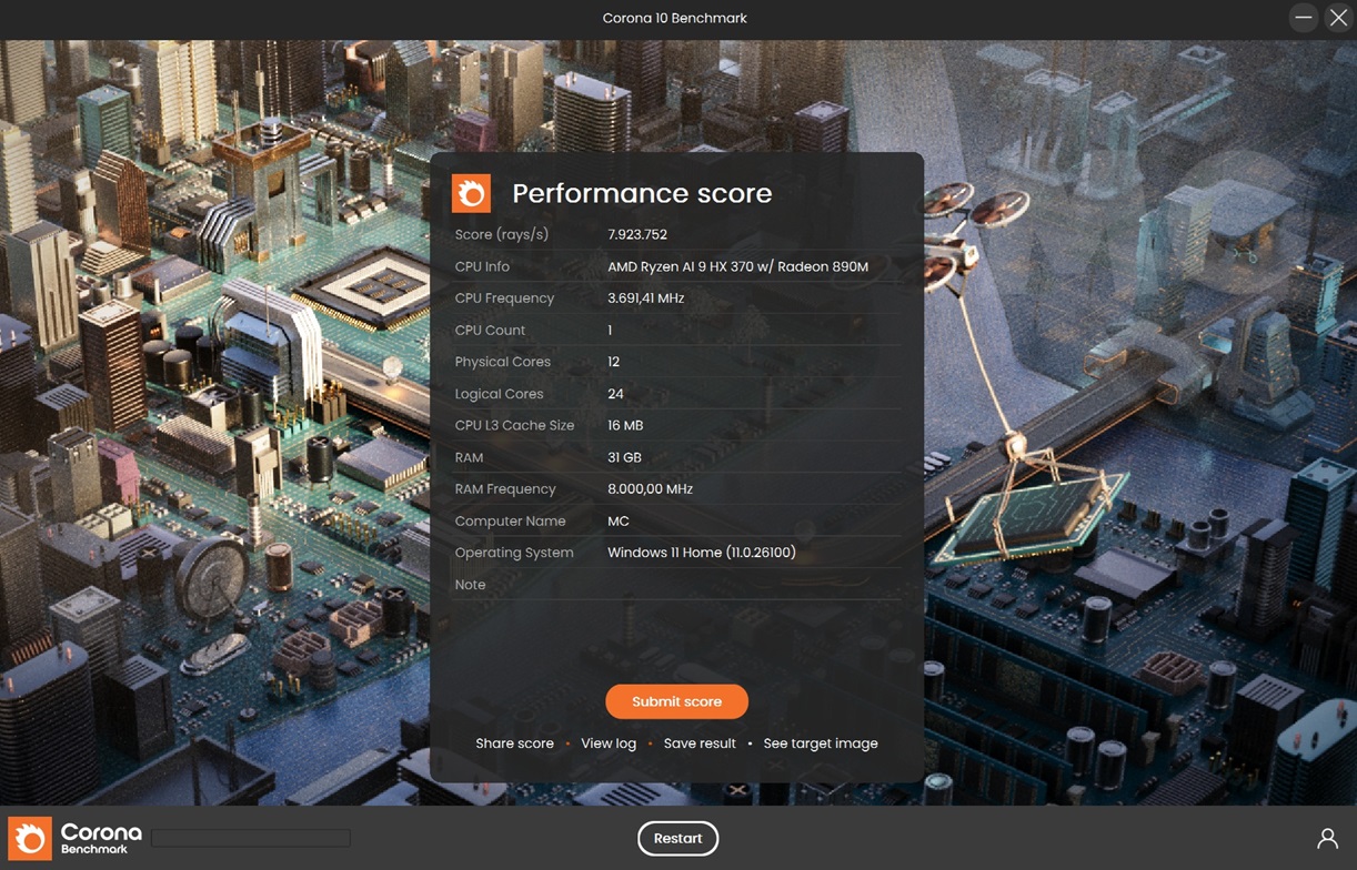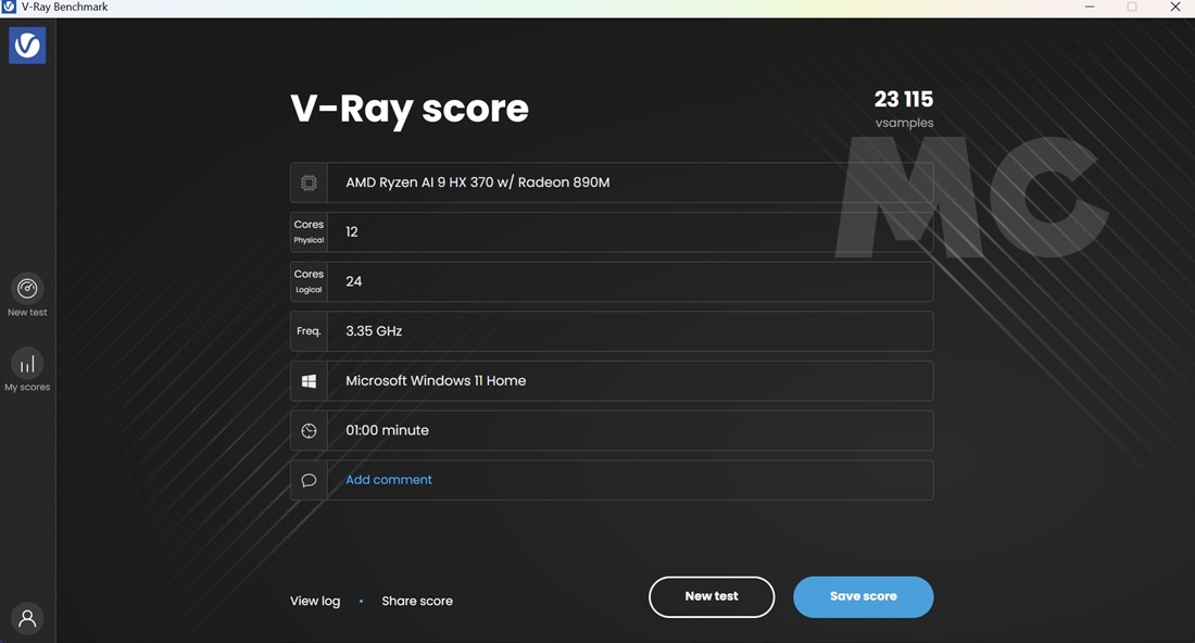 En la versión de esta prueba para CPU el resultado es de 23.115 «vsamples», una puntuación que está dentro de lo esperado, ya que los Ryzen AI 9 HX 370 siempre suelen superar los 23.000 «vsamples» en esta prueba.