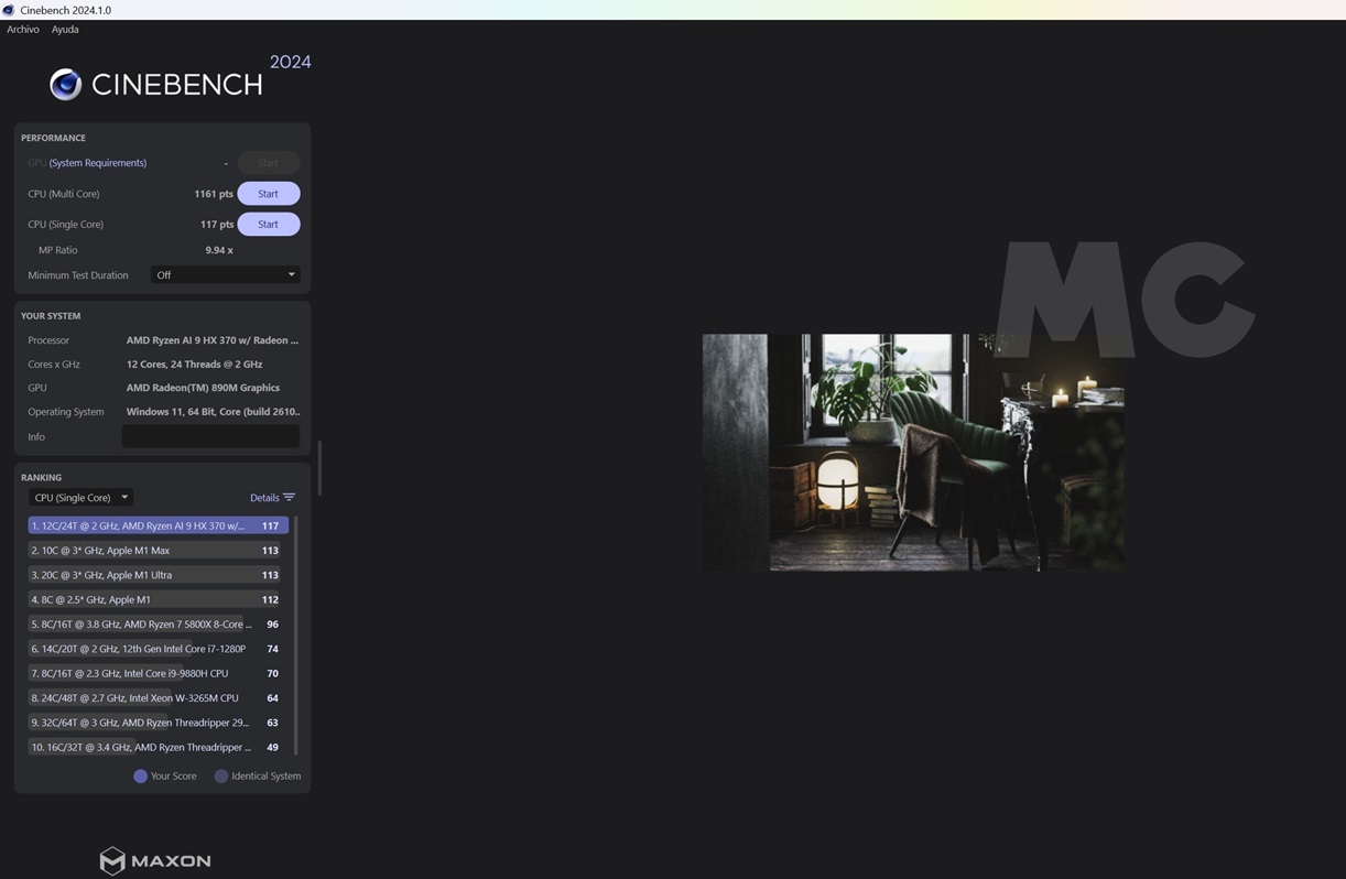 En esta prueba de renderizado por CPU conseguimos una puntuación de 1.988 en monohilo y 20.321 en multihilo. Buenos resultados, aunque quedan por debajo delos 2.257 y 37.819 puntos que logra el Intel Core Ultra 9 275HX.