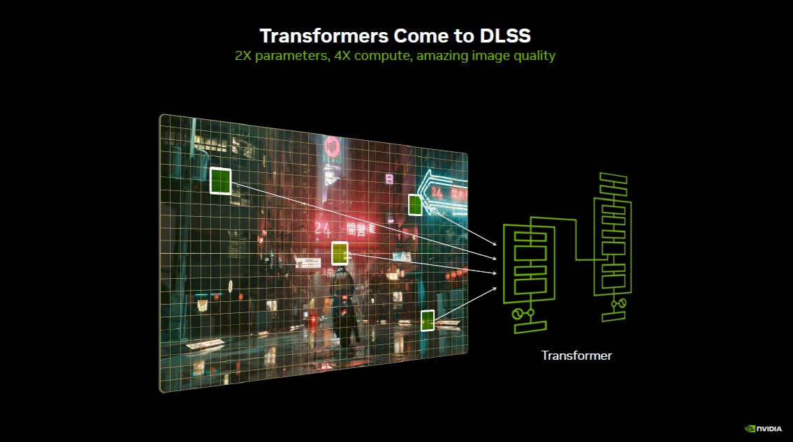 NVIDIA DLSS 4 es la otra gran novedad que nos ha dejado el gigante verde dentro de sus últimos avances en IA aplicada a gaming. Esta tecnología cambia el modelo CNN por un modelo de transformación para conseguir un reescalado y reconstrucción de la imagen de mayor calidad. Este nuevo modelo utiliza el doble de parámetros, y cuatro veces más potencia de computación.
