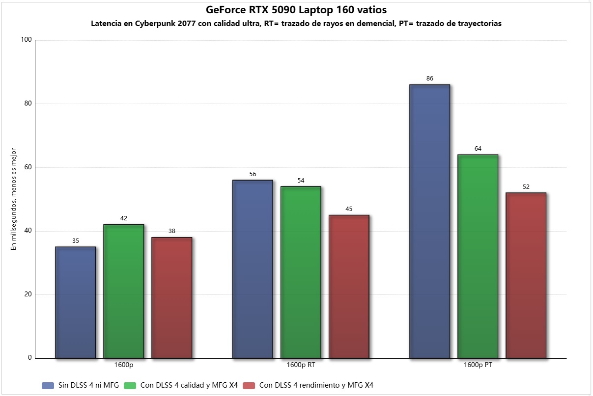 La latencia en juegos es muy importante, y como podemos ver en la gráfica adjunta utilizar DLSS y generación de fotogramas no solo puede ayudarnos a mejorar la tasa de fotogramas por segundo, sino que también puede ayudarnos a reducirla. La mejora más espectacular la tenemos al jugar con trazado de trayectorias activado, ya que podemos pasar de tener una latencia de 86 ms a reducirla a solo 52 ms con DLSS 4 en modo rendimiento y MFG X4 activado.