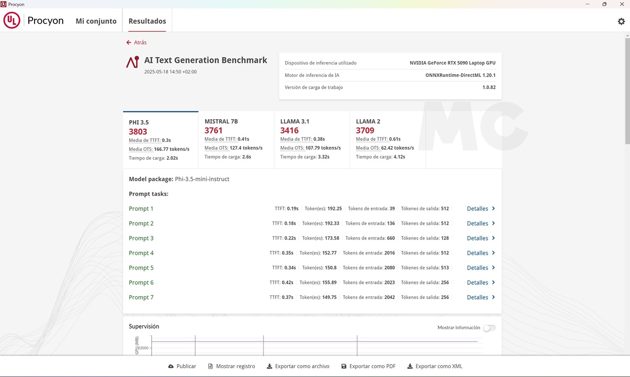 La prueba de generación de texto con IA es un paseo para la GeForce RTX 5090 Laptop, que consigue las puntuaciones más altas que he visto hasta el momento con una gráfica para portátil. Como referencia, la GeForce RTX 5080 Mobile con un TGP de 175 vatios alcanza los 3.435 puntos en MISTRAL 7B y 3.456 puntos en LLAMA 2.
