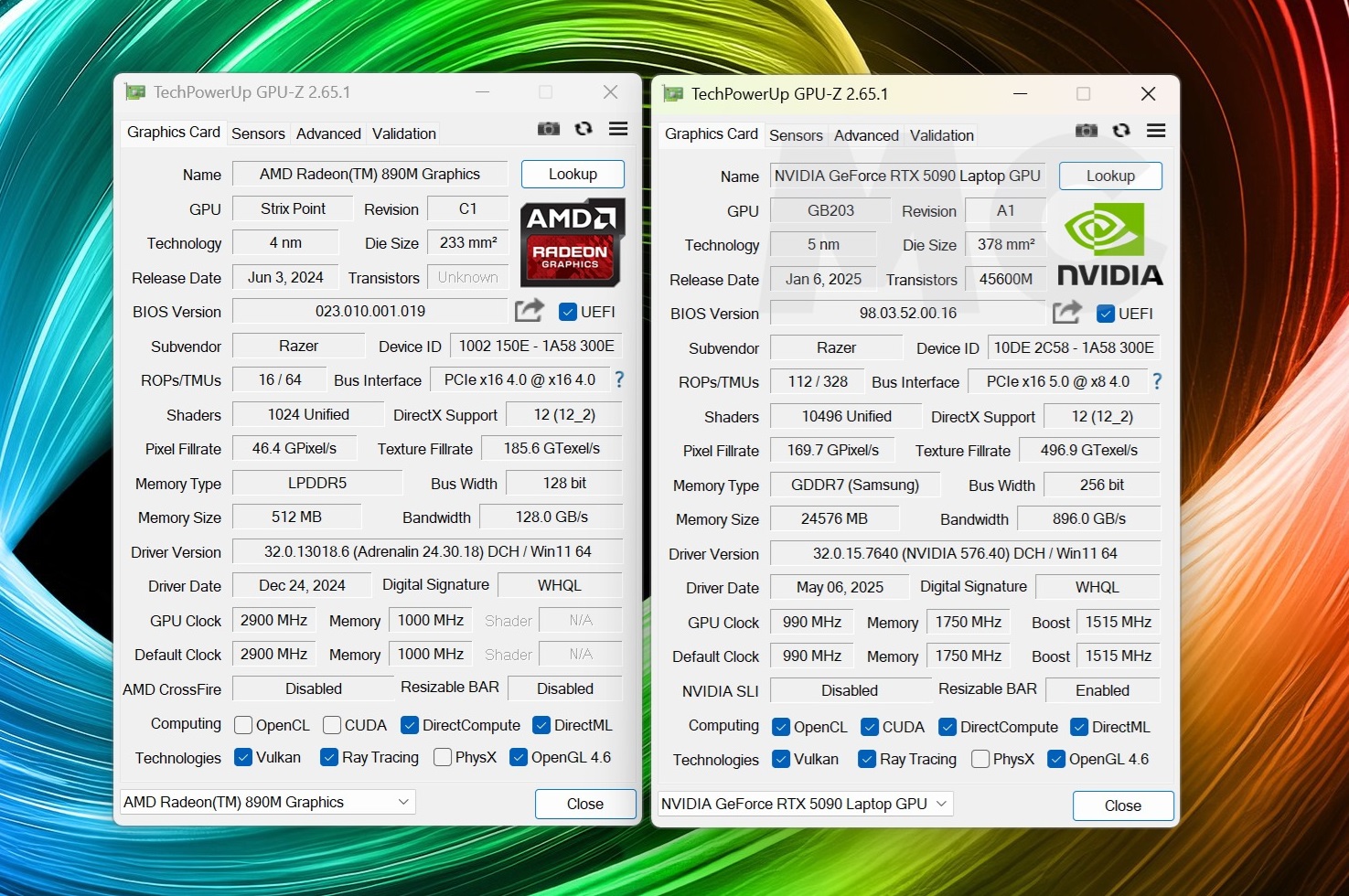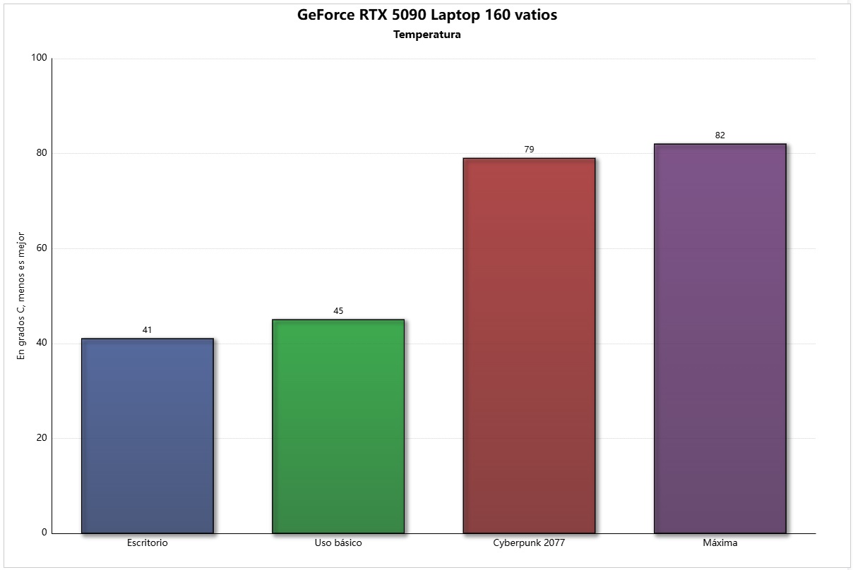 Por otro lado, la GeForce RTX 4090 Laptop tiene un TGP mayor que la GeForce RTX 5090 Laptop de este análisis. La primera tiene un máximo de 175 vatios, y la segunda un tope de 160 vatios. A todo esto hay que añadir, además, que la primera estaba montada en un PC más grande, voluminoso y con mejor refrigeración.