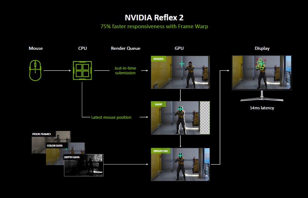 Esto es posible gracias a lo que se conoce como «renderizado predictivo», que utiliza información de la cola de renderizado y de datos de la última posición del ratón, así como de ciertos elementos del juego, como fotogramas anteriores, datos de color y también de elementos de profundidad.
