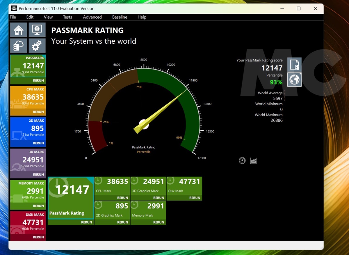 Una prueba de rendimiento general que nos sirve para medir el rendimiento completo de un equipo. El Razer Blade 16 2025 consigue 12.147 puntos, y es más potente que el 93% de los sistemas que PassMark tiene en su base de datos.