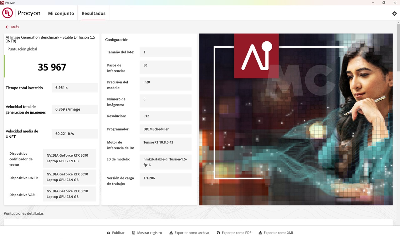 En esa prueba, pero utilizando INT8, la puntuación es de 35.967,y el tiempo de generación de imagen es de solo 0,86 segundos. Unos resultados excepcionales para una gráfica de portátil, que confirman que la GeForce RTX 5090 Laptop es la más avanzada y potente de su clase no solo en juegos, también en aceleración de IA.