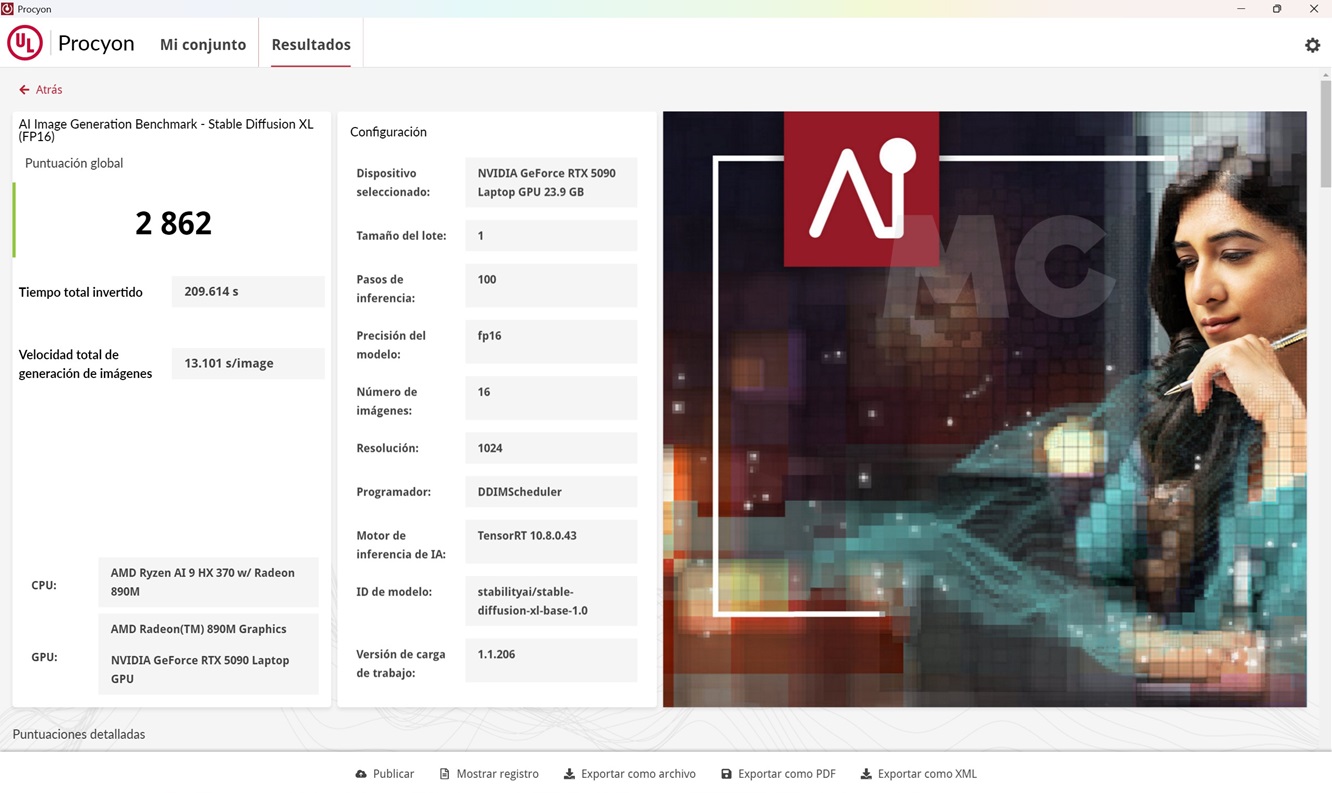 Procyon nos permite medir la potencia de la GeForce RTX 5090 Laptop en diferentes pruebas centradas en IA. En generación de imágenes con Stable Diffusion XL FP16 tenemos una puntuación de 2.862 y un resultado de 13,10 segundos por imagen generada, y en esa misma prueba pero en la versión estándar bajo FP16, que requiere menos memoria gráfica, tenemos una puntuación de 3.322 y un tiempo de 1,88 segundos por imagen generada.