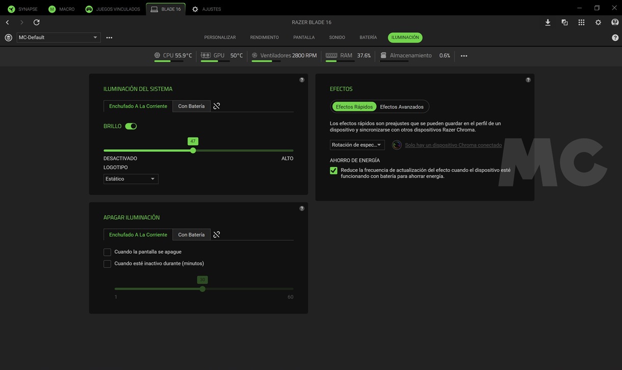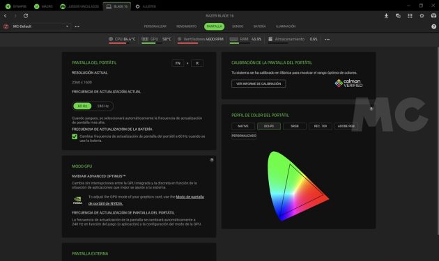 El software Razer Synapse nos permite configurar y personalizar diferentes aspectos del portátil, como por ejemplo los perfiles de rendimiento y la iluminación LED RGB. También podemos mejorar la refrigeración de este portátil con la Razer Cooling Pad, una base que se conecta por USB al portátil y que nos permite reducir hasta en un 18% la temperatura. Podéis ampliar la galería adjunta haciendo clic en ella.