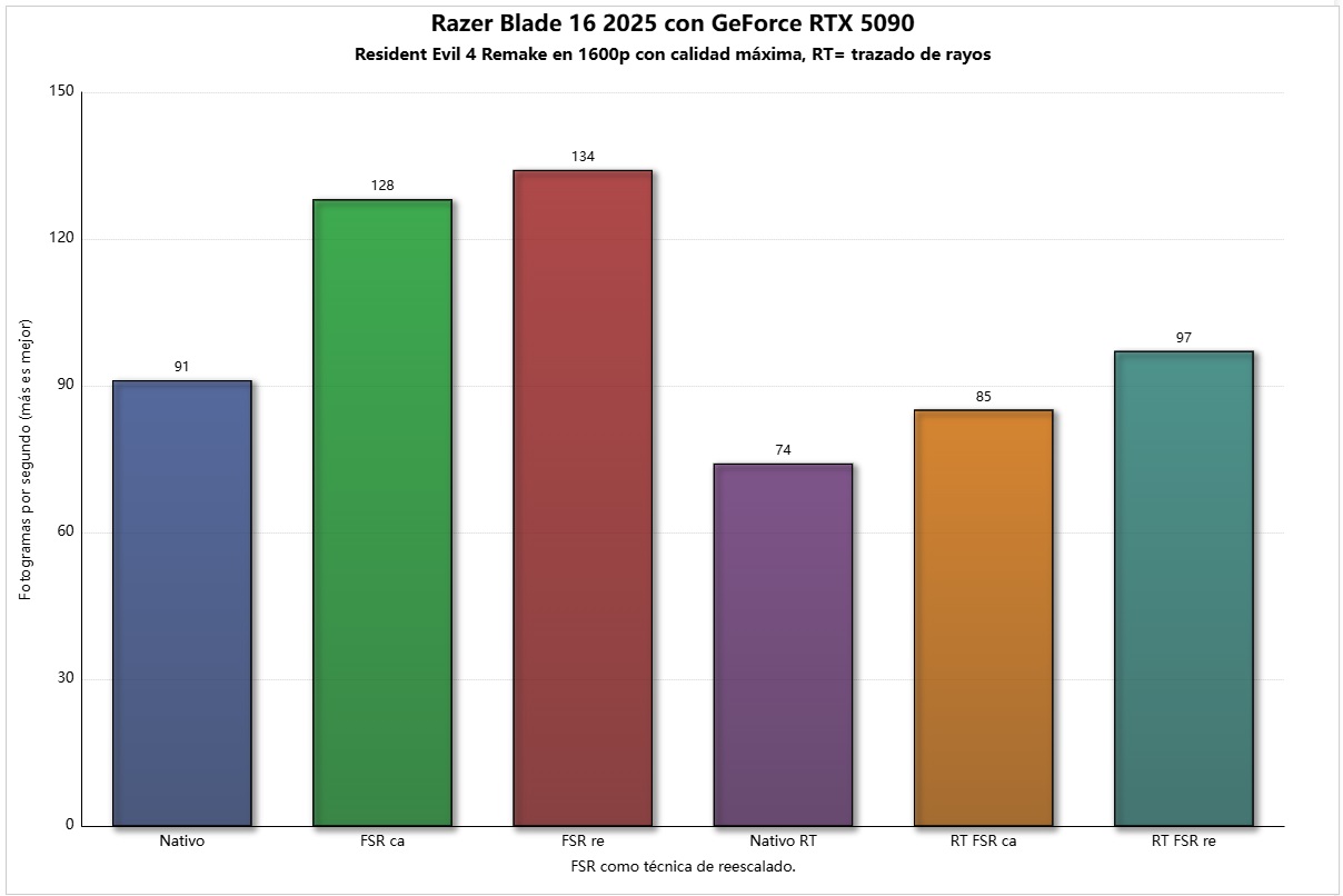 Resident Evil 4 Remake es un pase para la GeForce RTX 5090 Laptop, que consigue 91 FPS en nativo y 74 FPS con trazado de rayos activado. No es necesario activar FSR, y de hecho no es recomendable, porque reduce significativamente la calidad de imagen.