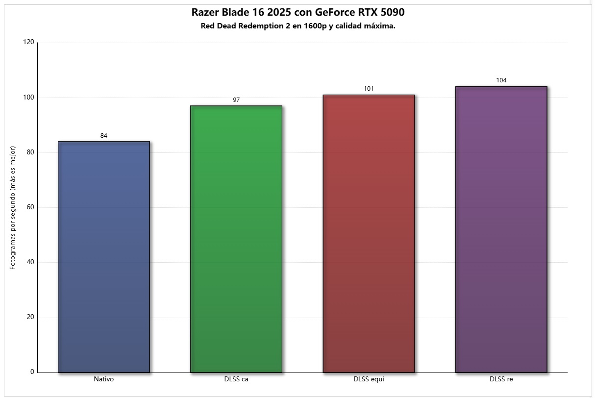 Red Dead Redemption 2 también funciona a la perfección con la GeForce RTX 5090 Laptop del Razer Blade 16 2025, que logra 84 FPS de media con calidad máxima en 1600p. Activar el DLSS en modo calidad nos llevará hasta los 97 FPS, pero no tiene sentido ir más allá, porque el escalado de rendimiento es mínimo.
