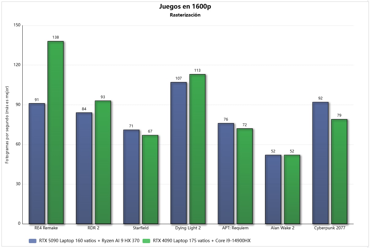 A pesar de todo, la GeForce RTX 5090 Laptop es capaz de conseguir victorias muy importantes en Cyberpunk 2077, Starfield y A Plague Tale: Requiem, y un empate en Alan Wake 2. La única derrota significativa la vemos en Resident Evil 4 Remake, y creo que es probable que se deba más a un tema de drivers que a otra cosa, o a que el juego, al ser un título pensado para la vieja generación, escale mucho mejor con la velocidad de la GPU.