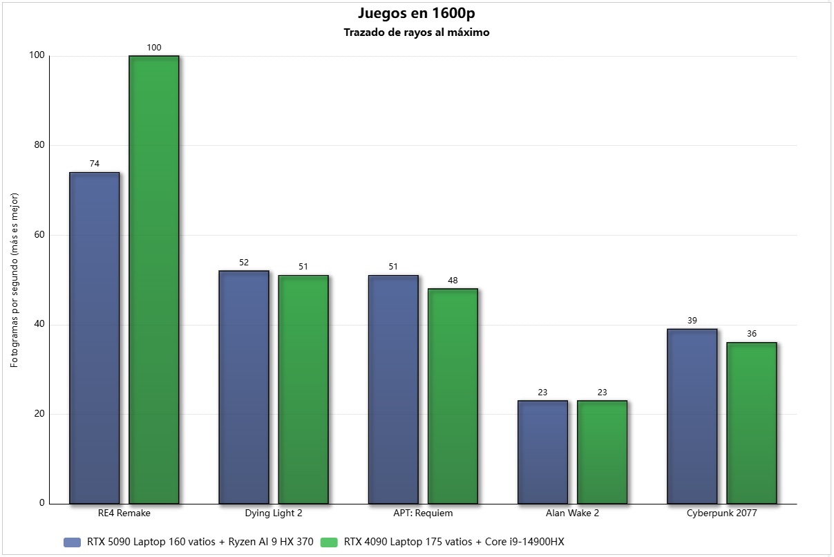 Con trazado de rayos activado la cosa está bastante igualada, pero la GeForce RTX 5090 Laptop gana en todas las pruebas, excepto en Resident Evil 4 Remake, donde ocurre lo mismo que en la prueba bajo rasterización. Está claro que ocurre algo que no vemos, y como os dije puede que se deba a un tema de drivers o de escalado con la mayor frecuencia de la GeForce RTX 4090 Laptop.