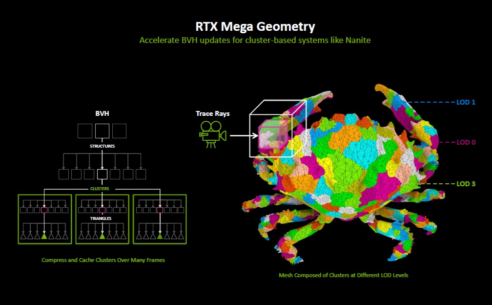 Esos motores especializados hacen que las nuevas tecnologías introducidas por NVIDIA para mejorar el rendimiento con trazado de rayos, como Mega Geometría, cuenten con todo el soporte que necesitan a nivel de hardware, y que puedan ofrecer un nivel de rendimiento superior en una GeForce RTX 50.