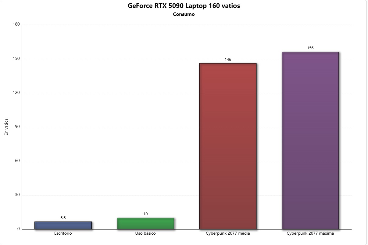 El consumo de la GeForce RTX 5090 Laptop se mueve dentro de lo esperado, con un pico de 156 vatios que se acerca mucho al máximo prometido por Razer, que es de 160 vatios. De media, suele oscilar entre los 135 y los 150 vatios, ya que el valor de consumo varía en tiempo real junto con las frecuencias y la temperatura de la GPU.