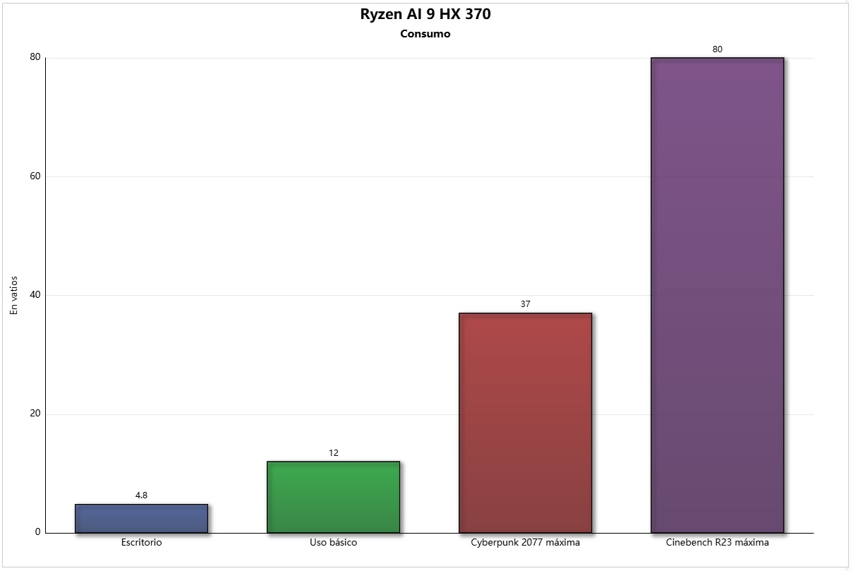 El consumo del procesador del Ryzen AI 9 HX 370 varía en función de la carga de trabajo, y tiene picos que alcanzan los 80 vatios en Cinebench R23, una prueba en la que la CPU está al 100% de carga. Con Cyberpunk 2077 no tenemos un nivel de carga tan elevado, y por eso los valores de consumo oscilan entre los 30 y los 37 vatios.