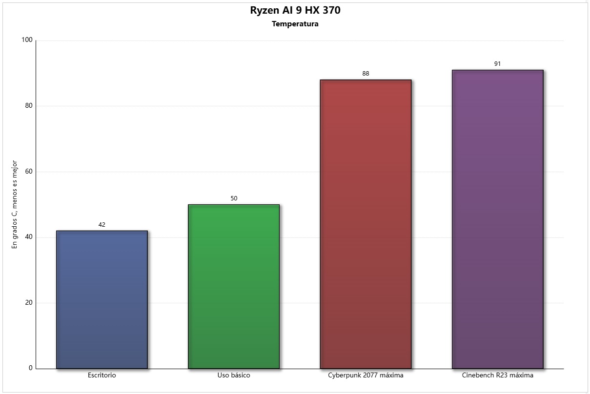 La prueba no ha podido realizar la medición de cada carga de trabajo para analizar las temperaturas que registra la CPU y sus frecuencias de trabajo, pero en general las puntuaciones obtenidas son buenas y cuadran con lo que podemos esperar de un Ryzen AI 9 HX 370. No tiene la CPU más potente del mercado para portátiles, pero ofrece un buen rendimiento tanto en monohilo como en multihilo.