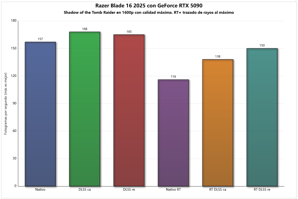 La GeForce RTX 5090 Laptop es tan potente en juegos que puede con cualquier título actual sin problemas a su resolución nativa con calidad máxima, y sin tener que recurrir ni al reescalado ni a la generación de fotogramas.