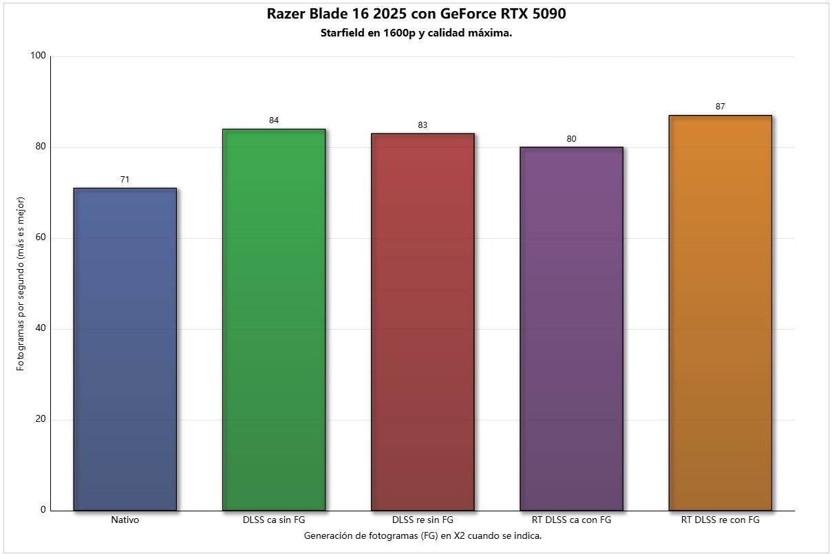 En Starfield el rendimiento que ofrece la GeForce RTX 5090 Laptop es muy bueno, ya que consigue 71 FPS en nativo con calidad máxima en una de las zonas más exigentes y con mayor dependencia de la CPU del juego, Nueva Atlántida. El escalado de DLSS en modo rendimiento es bueno, pero cuando activamos la generación de fotogramas el rendimiento no solo no mejora, sino que baja. Parece que hay algún tipo de problema a nivel de drivers o de soporte en el juego.
