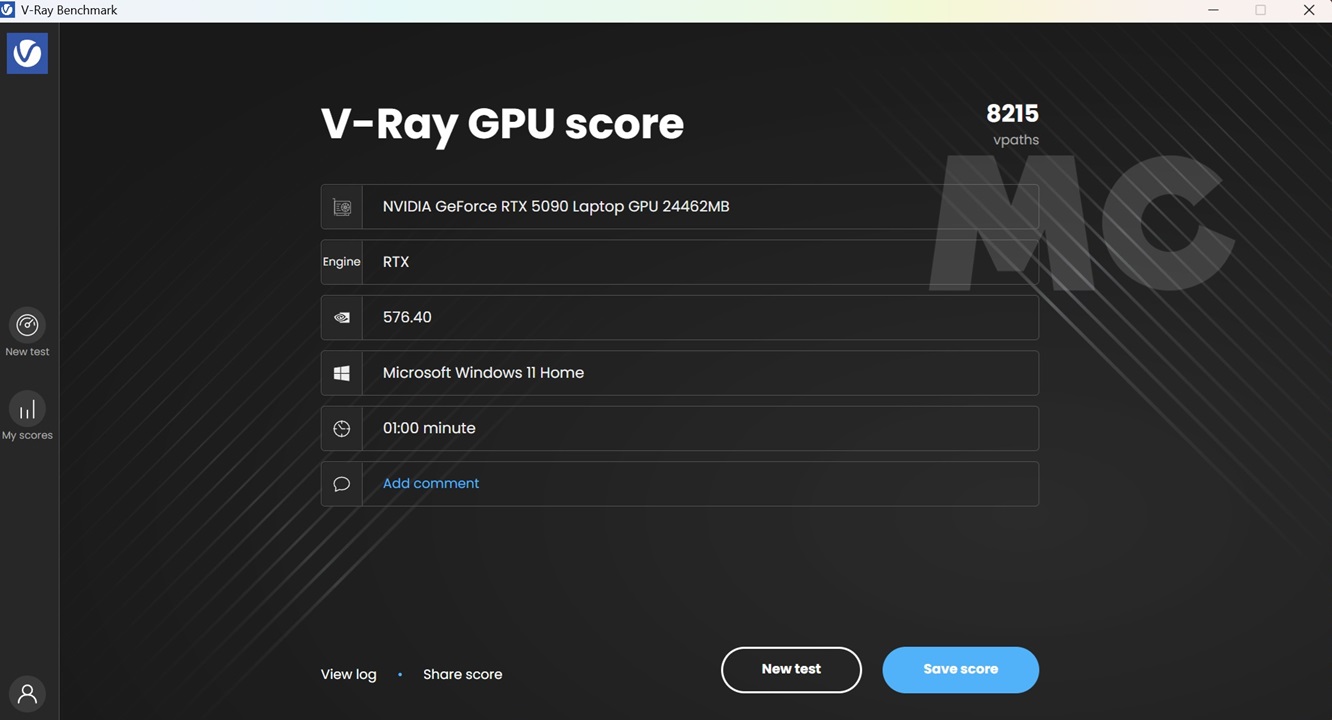 Volvemos con otra prueba de renderizado, que mide la capacidad de una tarjeta gráfica trabajando con y sin aceleración de trazado de rayos. Sin aceleración el Razer Blade 16 2025 consigue 5.520 «vpaths», y con aceleración el resultado sube a 8.215 «vpaths».