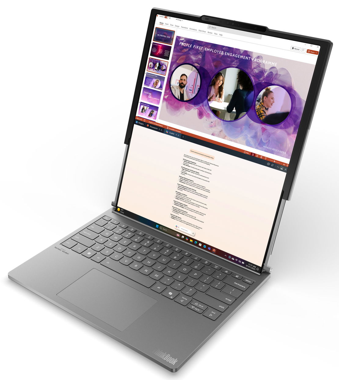 La última generación de los ThinkBook Plus estrena una pantalla enrollable como novedad mundial. El panel, con tecnología OLED, es capaz de expandirse en vertical desde 14 a 16,7 pulgadas, minimizando la necesidad de desplazamientos constante o múltiples pantallas. La ampliación de la pantalla se produce rápidamente, con un movimiento de la mano o presionando un botón situado en el teclado.