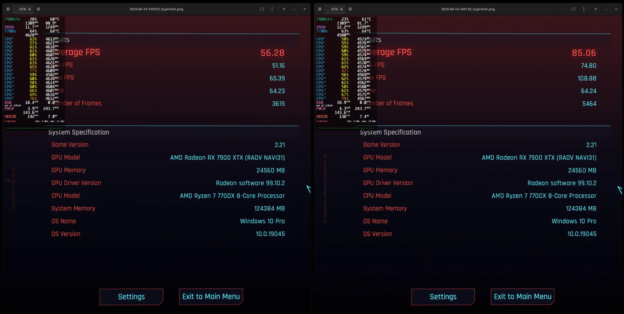Al forzar la ejecución de FSR 4 en una Radeon RX 7900 XTX en Cyberpunk 2077 el rendimiento es de 56,28 FPS, un dato negativo si lo comparamos con el resultado obtenido con FSR 3.1, que es de 85,06 FPS. En ambos casos se utilizó resolución 4K y el preajuste «calidad» en el modo de reescalado.