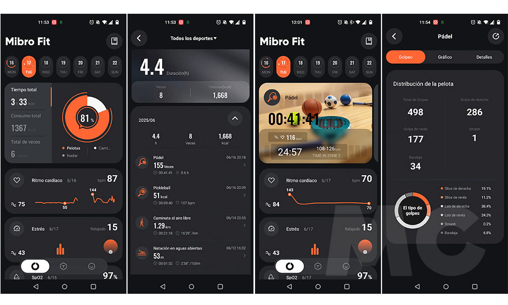 El modo padel no es un complemento más: es una de las funciones más bien resueltas de la Serie GS. Gracias al sensor de seis ejes y a la llamada Matriz Técnica 6D, el reloj puede identificar patrones de golpeo y medir la velocidad del swing con notable precisión —de 0 a 150 km/h en cuatro etapas—. Esta información es útil no solo para jugadores avanzados, sino también para quienes están mejorando su técnica y buscan datos objetivos sobre ritmo y postura. Pocas marcas han apostado por el padel con esta profundidad, lo que permite a Mibro dirigirse con claridad a una comunidad deportiva en expansión.