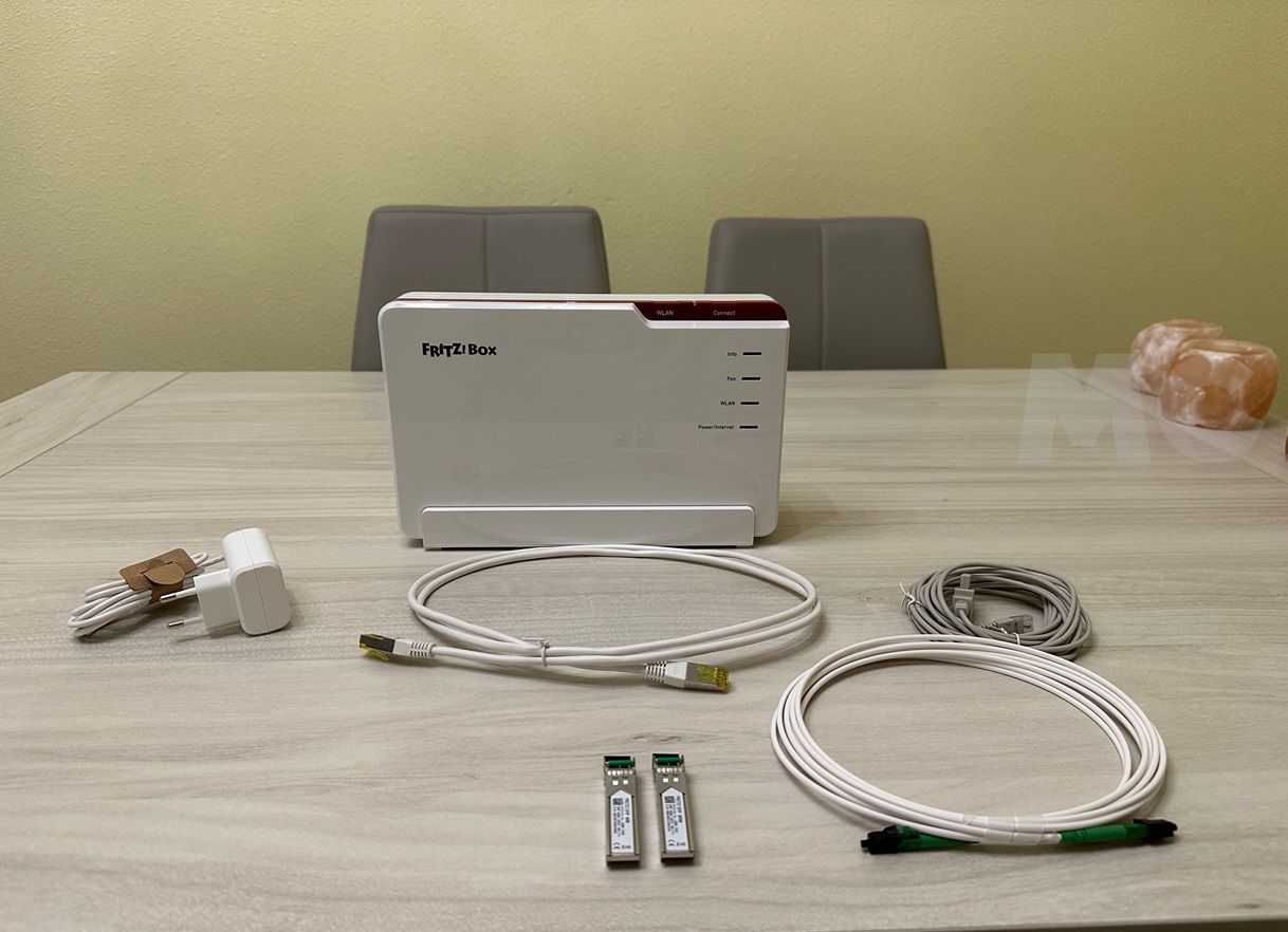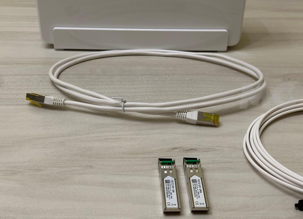 También tenemos en la caja los dos conectores FRITZ!SFP AON y FRITZ!SFP GPON, que se insertan en el módulo SFP para fibra. En España utilizamos el GPON, y nos permitirá disfrutar de ese pico de velocidad máximo de 2,5 Gbps que podemos conseguir con el FRITZ!Box 5690 Pro.