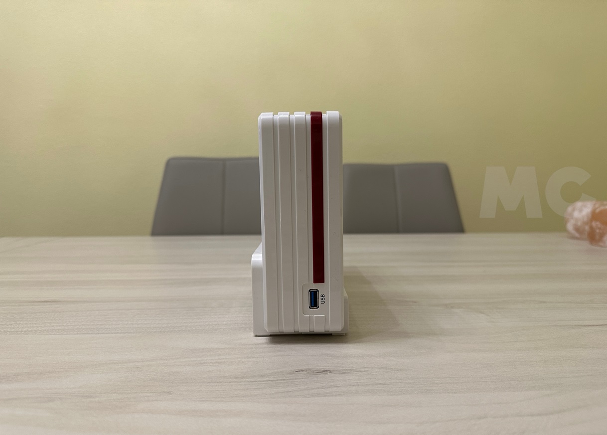 En la vista lateral podemos ver el diseño del FRITZ!Box 5690 Pro desde otra perspectiva, y se aprecia mejor el contraste que genera el toque de color ojo con el acabado en color blanco. También vemos un puerto USB 3.1 Type-A, que podemos utilizar para conectar dispositivos de almacenamiento y periféricos.