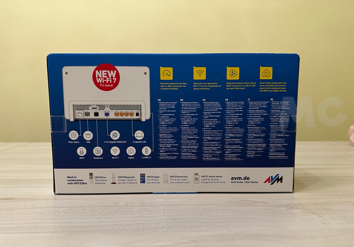 El FRITZ!Box 5690 Pro se presenta en una caja de cartón que ya nos deja ver sus funciones, características y tecnologías más importantes, entre las que destacan sin duda su compatibilidad con el estándar Wi-Fi 7 y sus tres bandas (6 GHz, 5 GHz y 2,4 GHz).